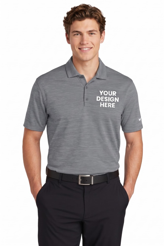 8.1-oz, 100% polyester fabric with at least 75% recycled content. Dri-FIT moisture management technology. Rolled forward shoulder seams. Contrast heat transfer Swoosh logo at left sleeve. Nike embossed buttons. Double needle hemmed bottom. Breathable. Tagless. Classic fit.  Due to the nature of polyester, special care must be taken throughout the decoration process. Please refer to product size spec PDF file for more details.