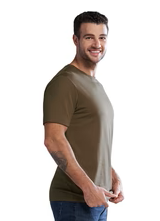 160 GSM - 4.7oz/yd2 - 8 oz./lin. yd. Solids - 100% certified organic cotton jersey, Heathers - 80% certified organic cotton, 20% polyester jersey. 28 single combed compacted yarn. Rib knit neckline with spandex for shape retention. Jersey knit back neck tape. Tear-away label. Side seamed. Crewneck for Adult and Scoop neck for ladies equivalent S05501.